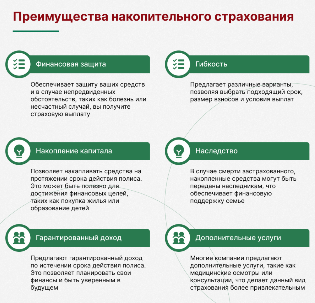 Накопительное страхование жизни – это продукт "два в одном". С одной стороны, клиент формирует накопления за счёт регулярных взносов, с другой – получает встроенную страховую защиту на случай непредвиденных событий на весь срок действия договора.