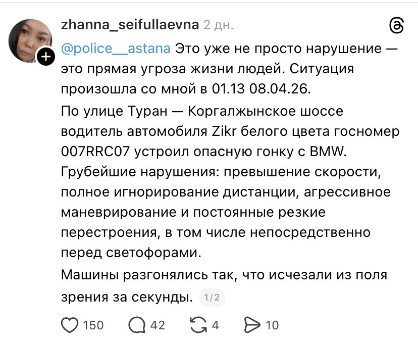 “Это уже не просто нарушение — это прямая угроза жизни людей”, — с такими словами обратилась жительница столицы после ночного инцидента на одной из оживленных магистралей, передает Liter.kz.