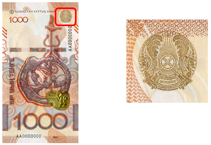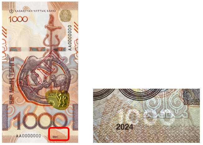 С краю банкноты, возле числа 2024, стоит водяной знак, или электротип, в виде изображения номинала.