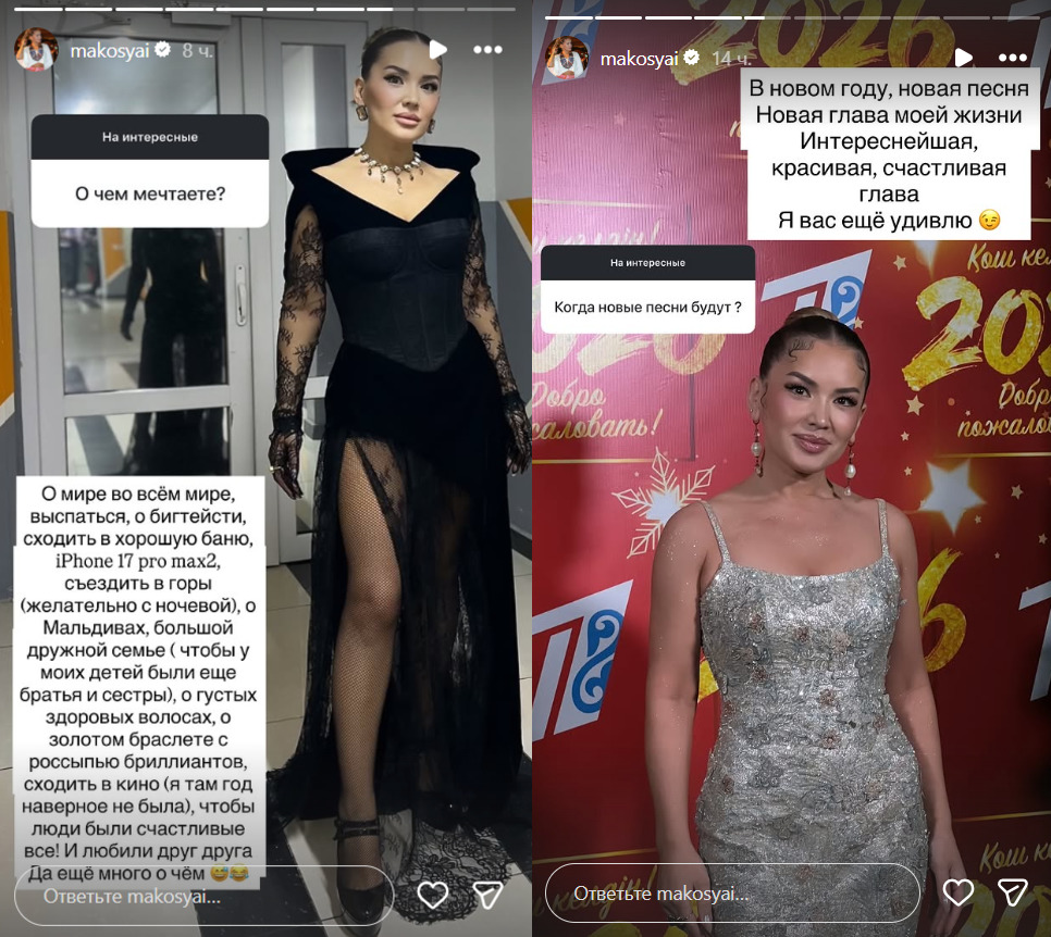 “О мире во всем мире, выспаться, о бигтейсти, сходить в хорошую баню, iPhone 17 Рro Мax2, съездить в горы (желательно с ночевой), о Мальдивах, большой дружной семье (чтобы у моих детей были еще братья и сестры), о густых здоровых волосах, о золотом браслете с россыпью бриллиантов, сходить в кино (я там год, наверное, не была), чтобы люди были счастливые все! И любили друг друга. Да еще много о чем”, – сказала Макпал.