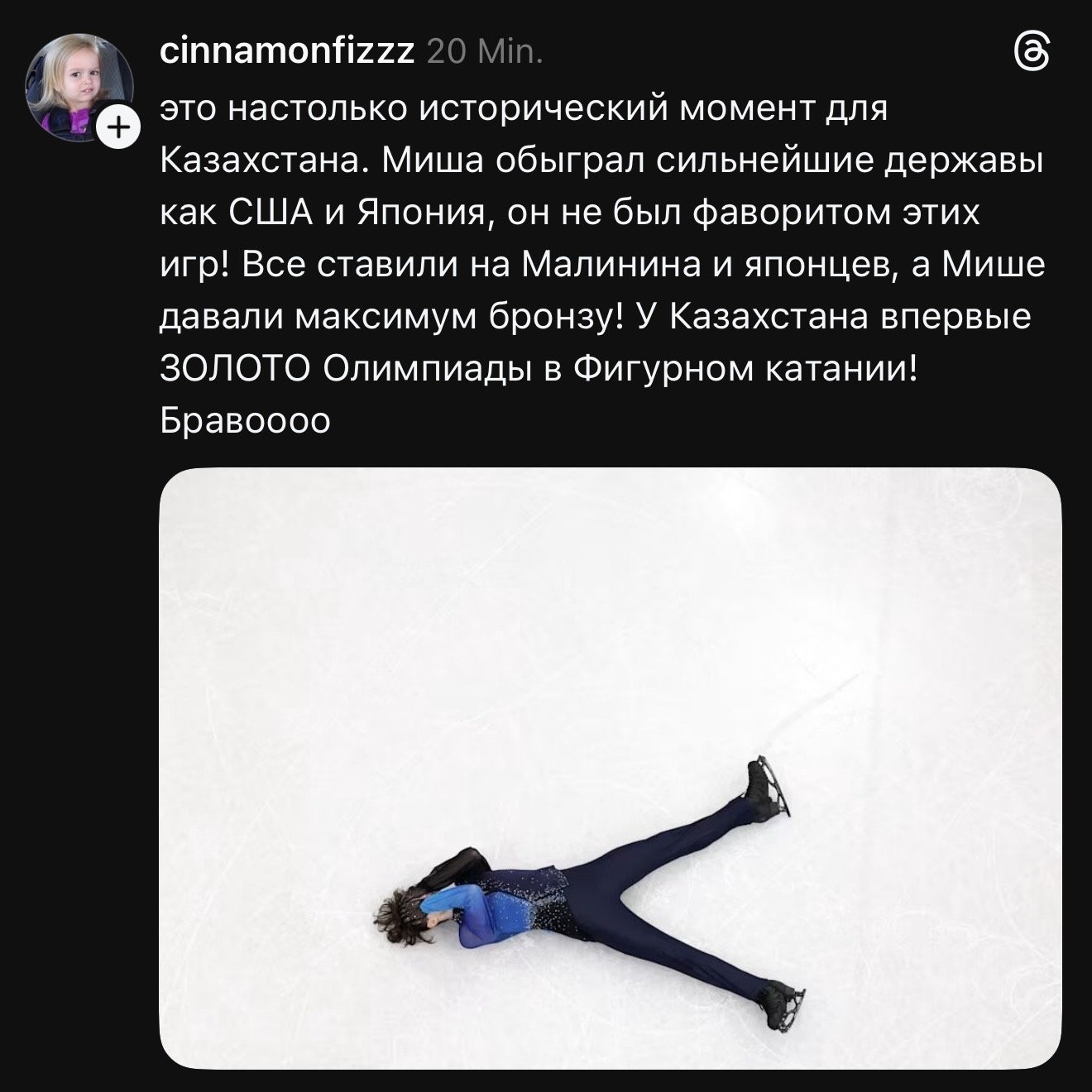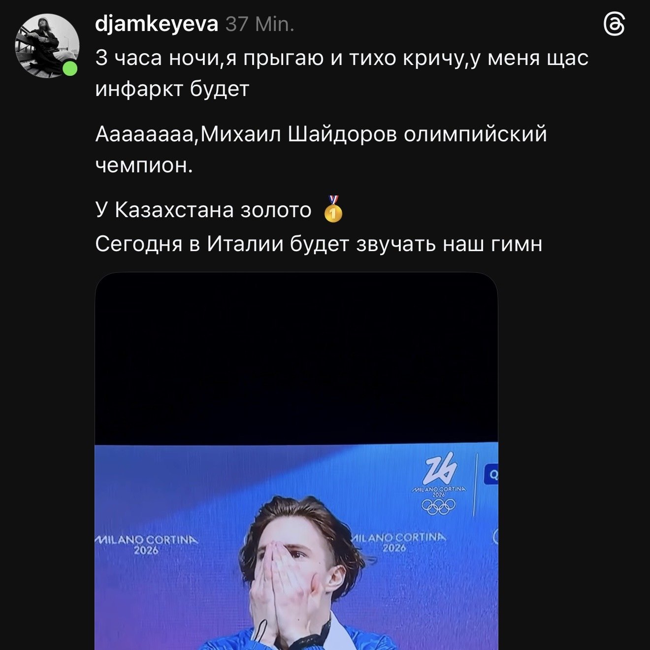 Этот успех стал историческим, потому что золото в фигурном катании Казахстан получил спустя 12 лет после бронзовой медали Дениса Тена на Олимпиаде-2014. Скажем, казахстанцы тихо таили надежду на победу, и многие не спали, следя за выступлением.