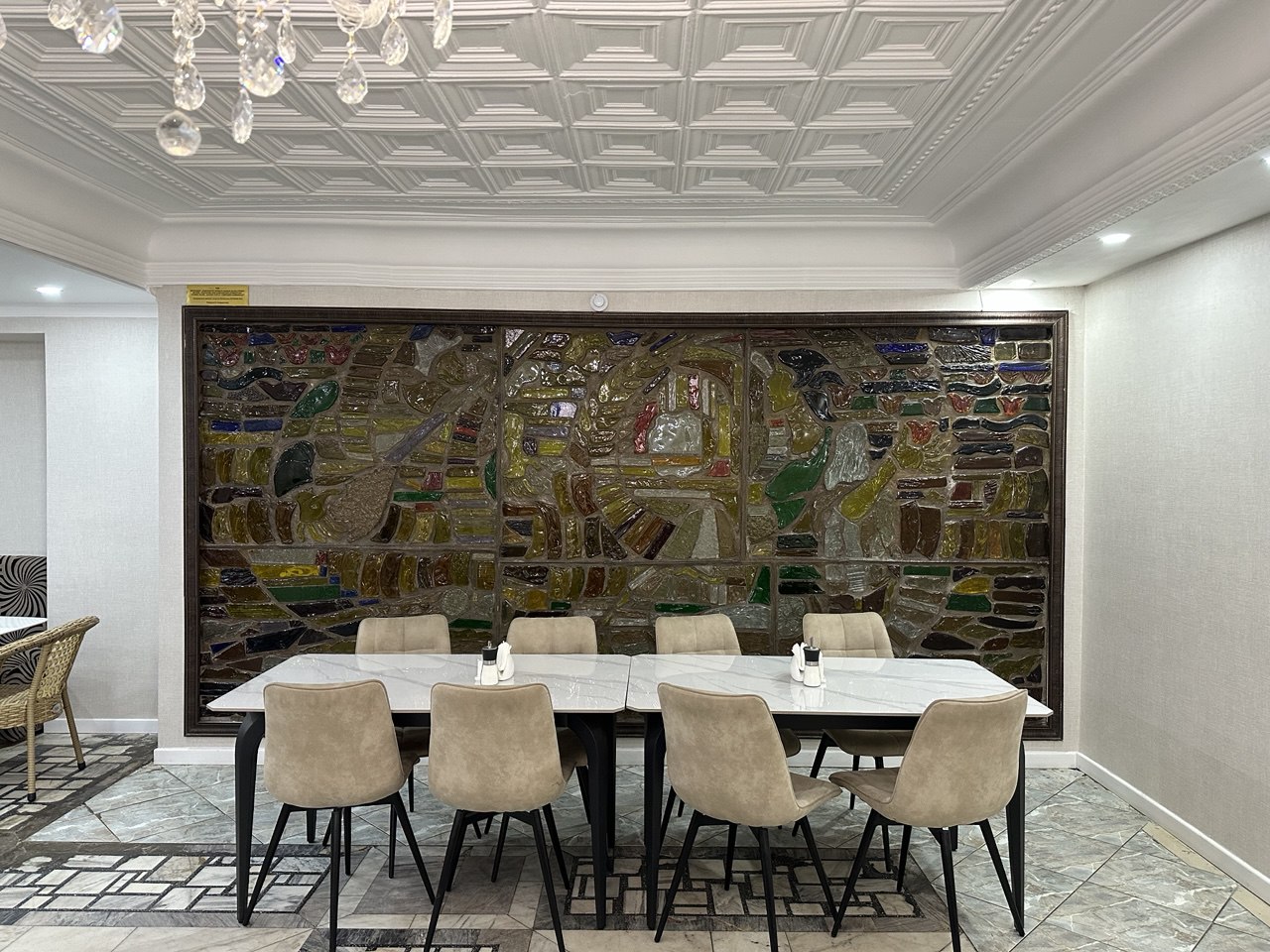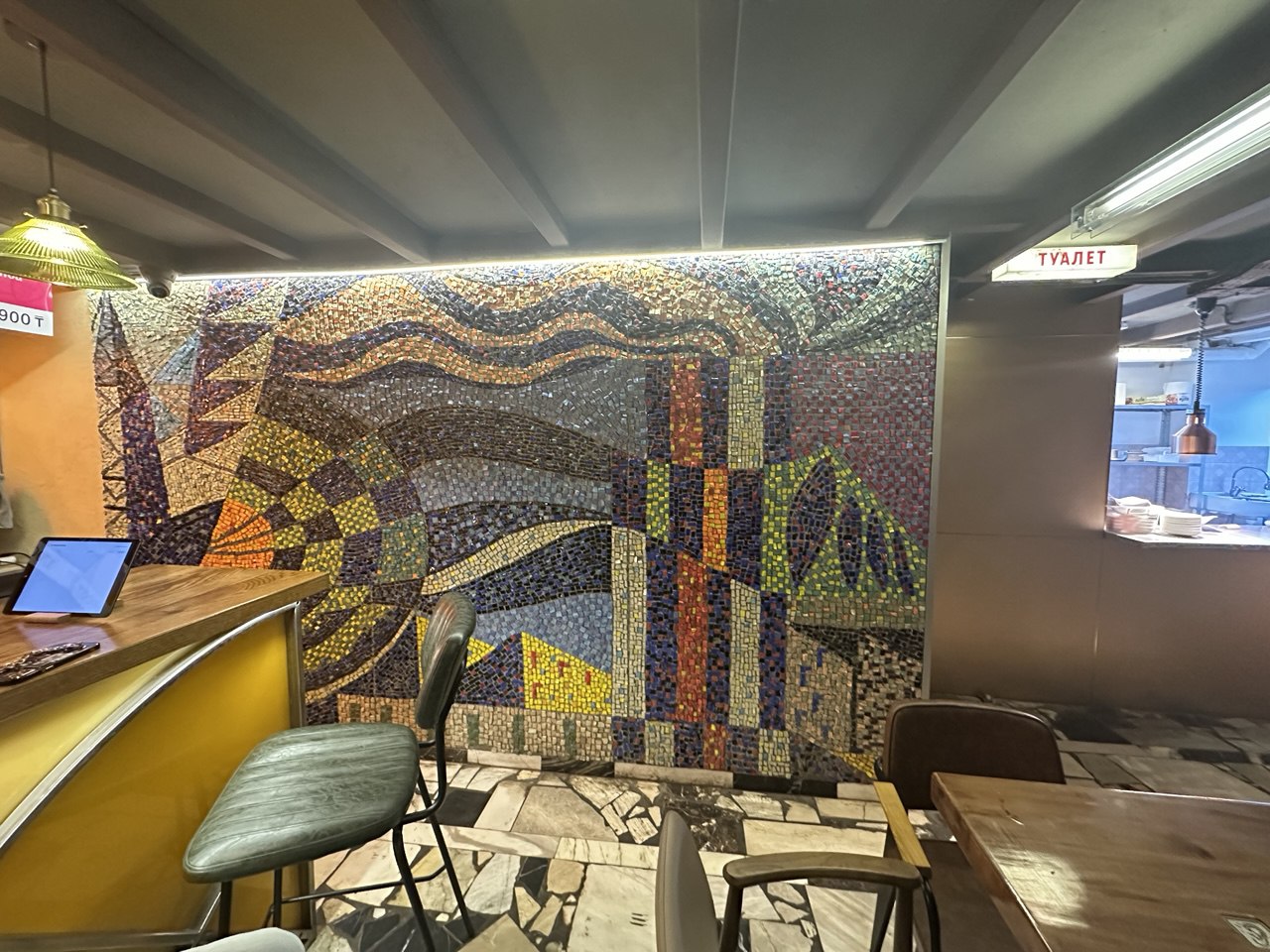 «Когда наше заведение открывалось, мы хотели создать частичку правого берега на левом. Идея заключалась в том, чтобы сделать мозаику. Сначала думали купить новую, но потом увидели в одном из старых зданий на правом берегу, которое шло под ремонт, панно, которое просто собирались уничтожить. Мы договорились и выкупили мозаику», — рассказывает директор заведения Виолетта Абылкаирова.