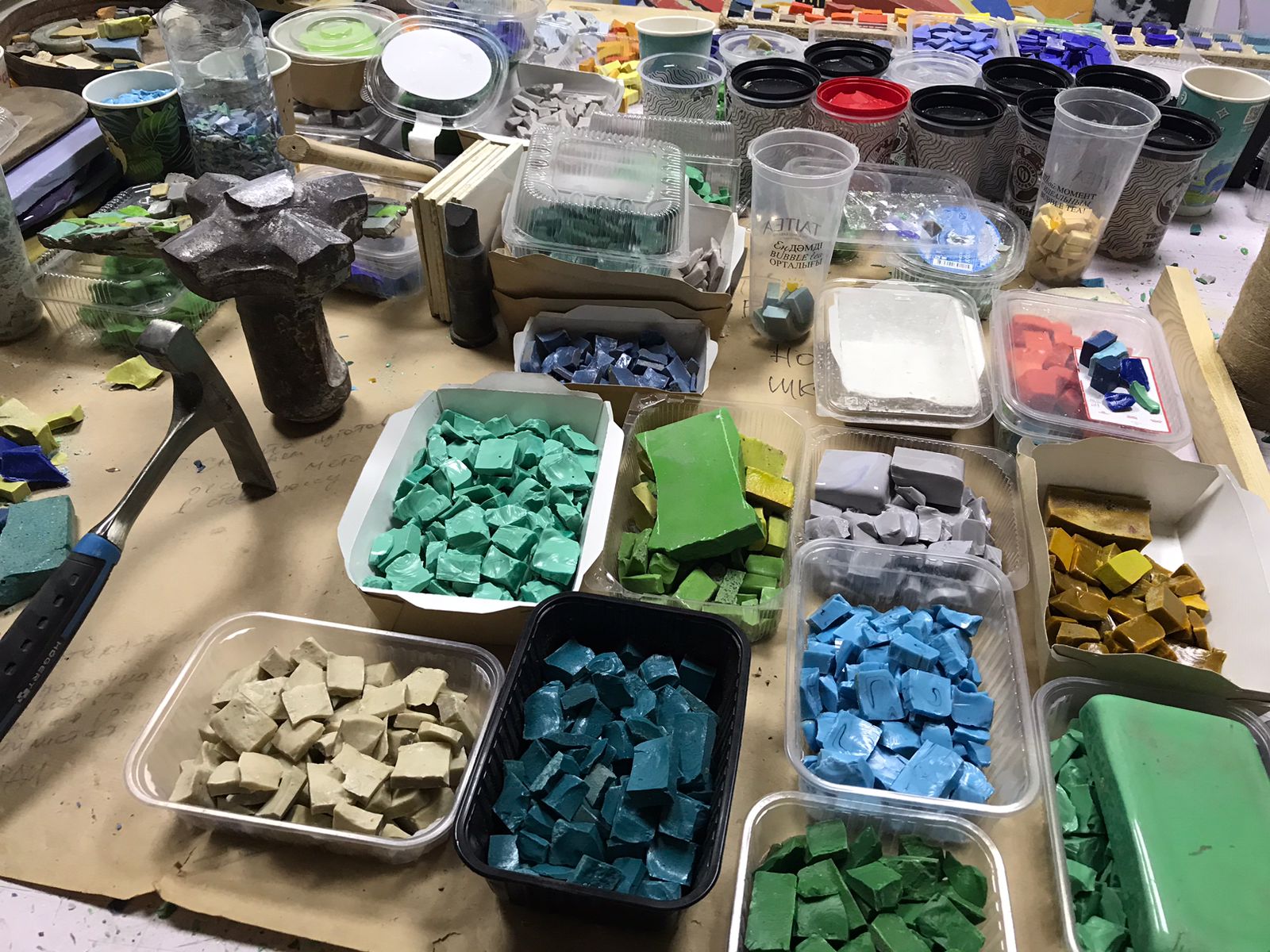 «Самое главное — материал очень дорогой, да и как его привезти? Если заказывать, это будет стоить сотни миллионов. Нужно ехать либо в Россию, либо в Италию. В Казахстане смальту не производят. Отец раньше ездил за ней в Беларусь, в Россию — тогда были большие объёмы», — говорит Ярослав.