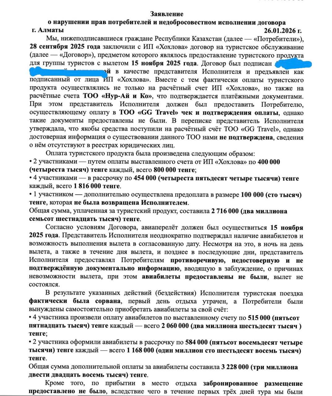 В редакцию обратились новые пострадавшие Амина Мусина и Шолпан Сеилханова, которые утверждают, что столкнулись с тем же сценарием, что и герои прошлогодней публикации. По их словам, деньги за туры принимались заранее, при этом билеты и ваучеры обещали предоставить в день вылета, а любые проблемы объяснялись техническими сбоями, овербукингом или ошибками партнёров. Фактически же, как утверждают собеседники, реальные бронирования отсутствовали, а возврата дененг людям приходилось добиваться месяцами.