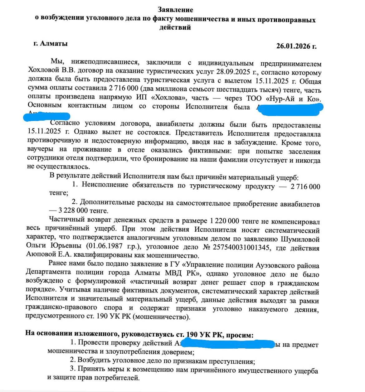 Позже она действительно перевела деньги за проживание и пообещала вернуть всю сумму тура. Это временно снизило напряжение. Однако деньги так и не поступили. Сроки постоянно переносились. Когда потерпевшие обратились в полицию Алматы, заявление приняли, но уголовное дело не возбудили. Основание — часть обязательств была формально исполнена.