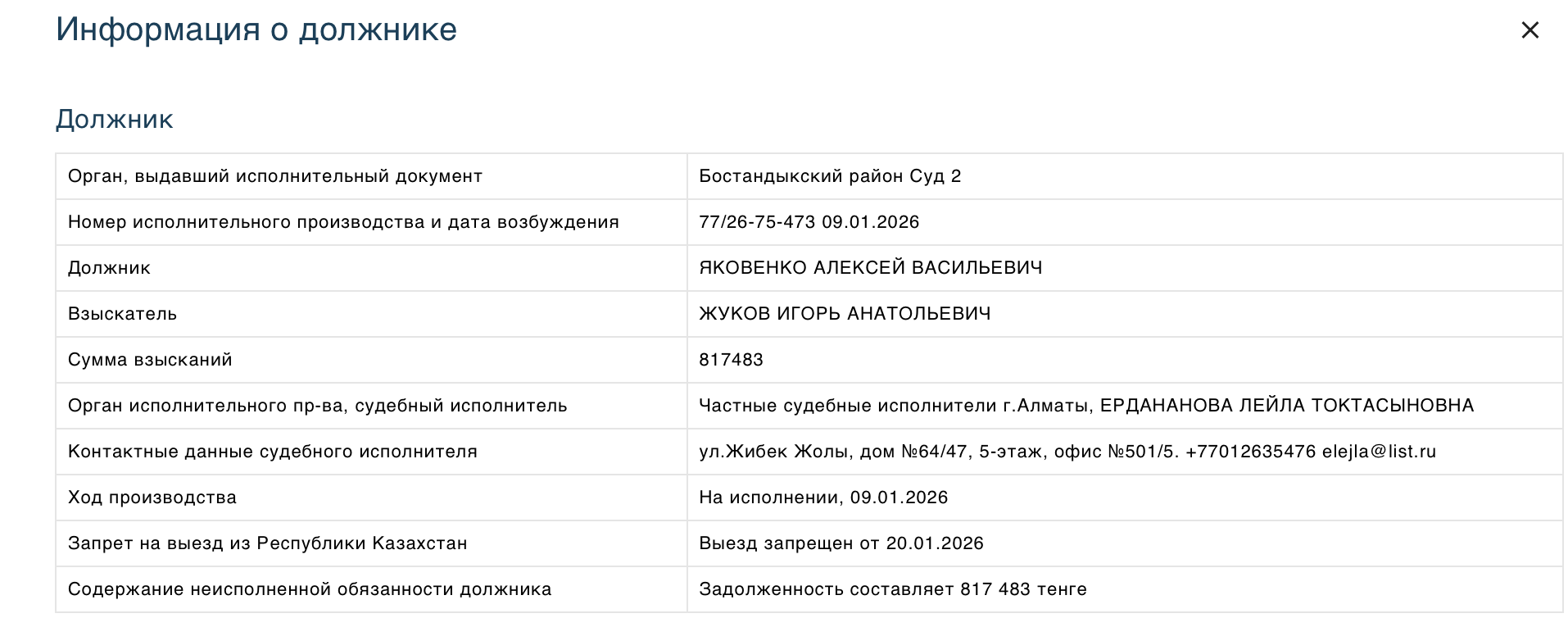 Согласно данным из открытых источников, наложен арест на банковские счета ИП. Также действуют запрет на совершение нотариальных действий и запрет на выезд из Казахстана. За ИП числится налоговая задолженность. Кроме того, на директоре зарегистрировано девять исполнительных производств на общую сумму более 5,5 млн тенге по исполнительным надписям.