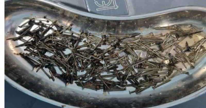 Науқастың асқазанынан алынған заттар арасында шегелер, бұрандалар және түйреуіштер табылған. Науқас оларды күйзеліс жағдайында жұтқанын айтып түсіндірген.