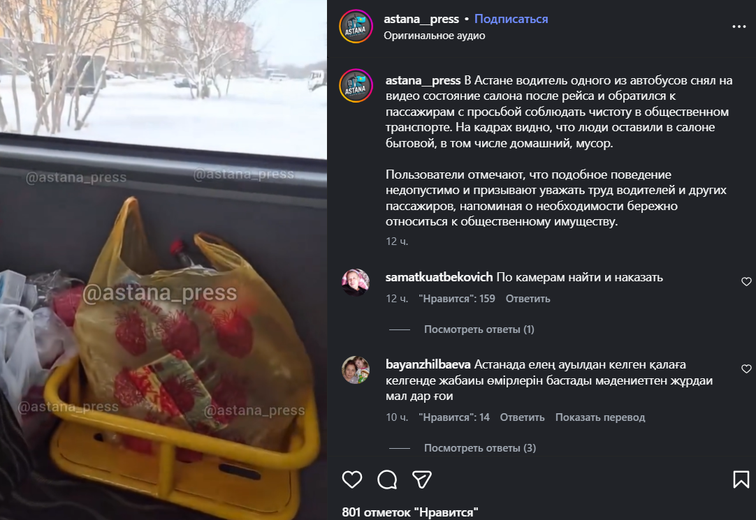 Водитель одного из автобусов Астаны снял на видео состояние салона после рейса и обратился к пассажирам с просьбой соблюдать чистоту в общественном транспорте, передает Liter.kz со ссылкой на astana__press.