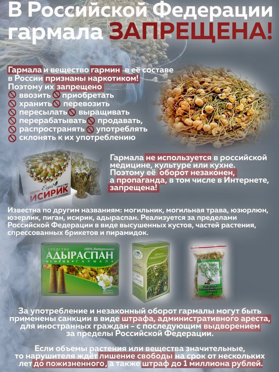 Напомним, растение гармала (адыраспан) включено в перечень растений, содержащих наркотические средства или психотропные вещества либо их прекурсоры на территории Российской Федерации с 7 февраля 2024 года.