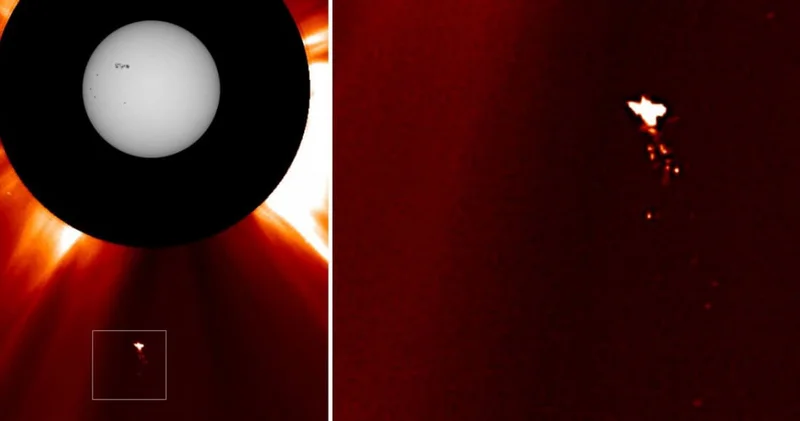 Напомним, в мае 2025 года красивый и загадочный снимок огненной птицы у Солнца поступил с одного из телескопов LASCO. На изображении как будто бы отчетливо видна "птица" или "летательный аппарат" с тянущимся за ним "пламенным следом". Размер крыла "птицы" около 150 тысяч км.