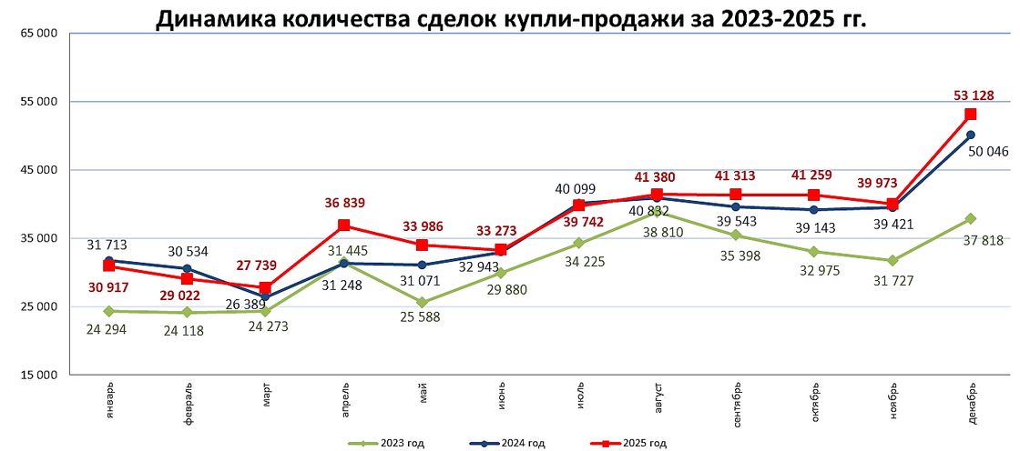 В декабре 2025 года, согласно данным Бюро национальной статистики, в Казахстане было оформлено 53 128 сделок купли-продажи жилья. Это сразу на 32,9% больше, чем было месяцем ранее. За год рост составил 6,2%. Это также максимум за последние три года.