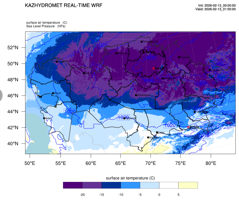 WRF вычисляет температуру воздуха, осадки, скорость и направление ветра, а также строит метеограммы для всех регионов Казахстана.