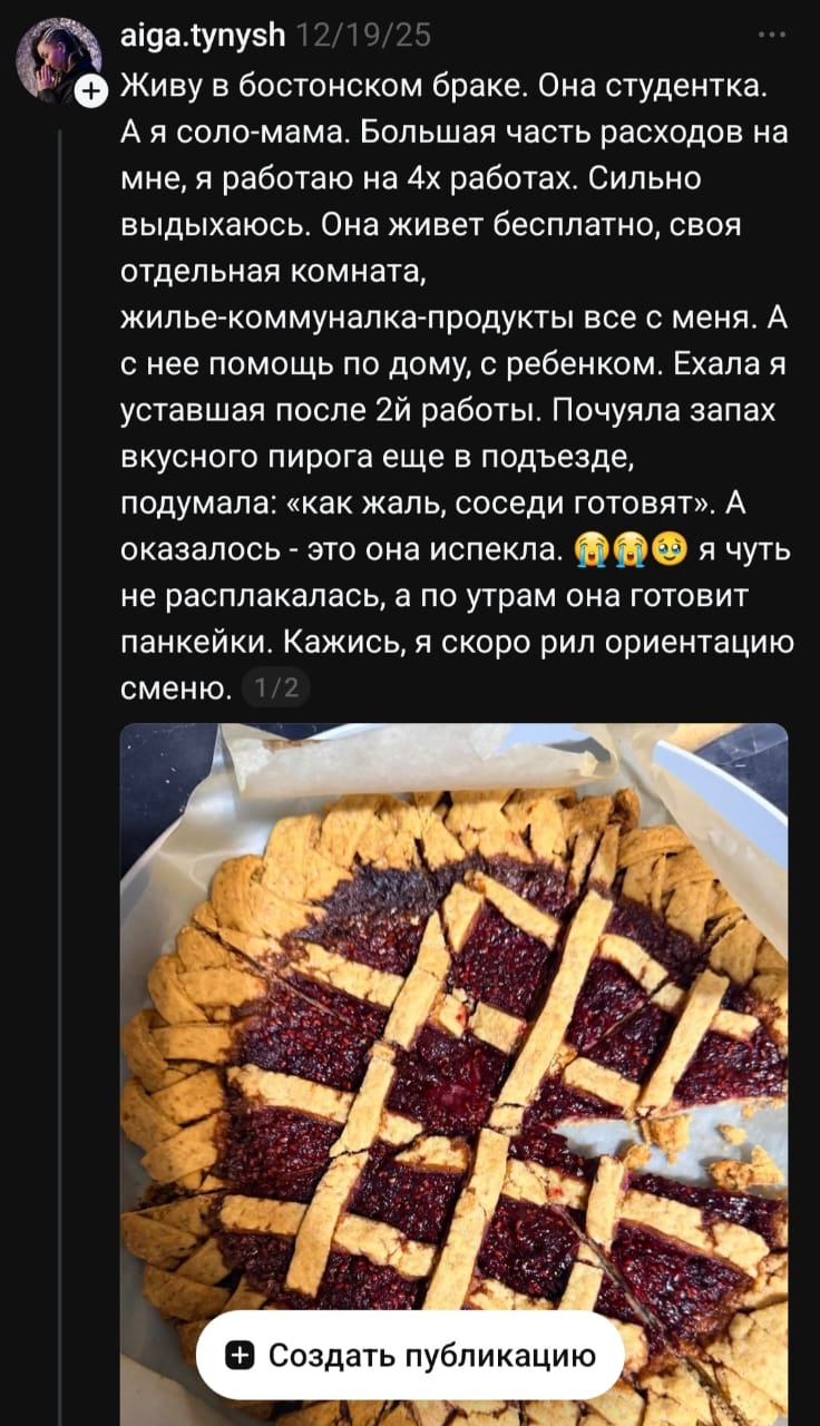 "Бостон некесінде тұрып жатырмын. Ол – студент, ал мен – жалғызбасты анамын. Шығындардың басым бөлігі менің мойнымда, төрт жерде жұмыс істеймін. Өте қатты шаршаймын. Ол тегін тұрады, өзінің жеке бөлмесі бар, баспана, коммуналдық қызметтер мен азық-түліктің бәрін мен төлеймін. Ал оның міндеті – үй шаруасына көмектесу және балаға қарау... Бірде... кіреберістің өзінен-ақ дәмді бәліштің иісі сезілді... Сөйтсем, оны сол қыз пісіріпті. Мұны көріп, жылап жібере жаздадым...".