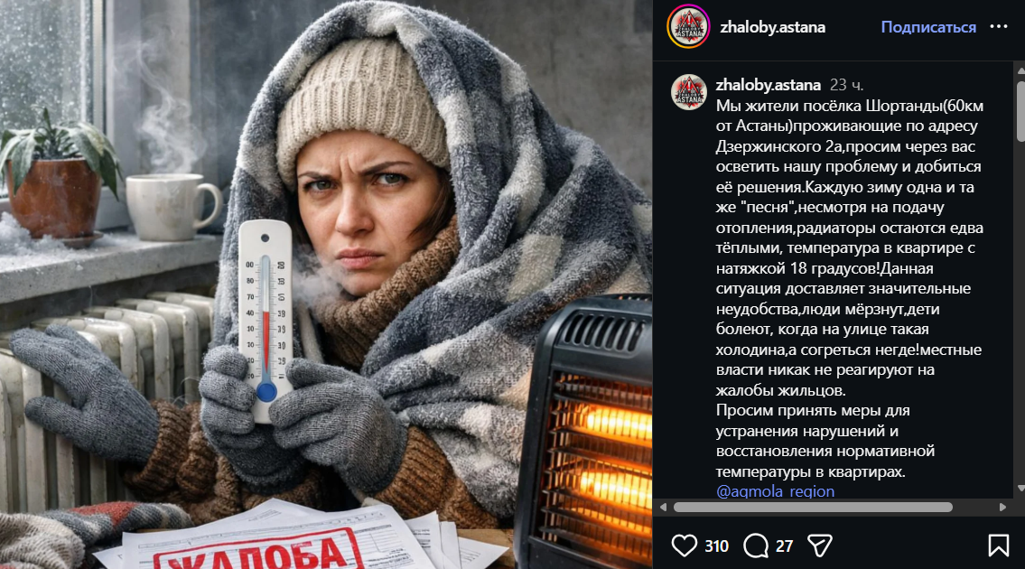 Жители поселка Шортанды обратились с жалобой на низкую температуру в квартирах в зимний период. По словам жильцов дома по адресу Дзержинского, 2а, несмотря на подачу отопления, радиаторы остаются едва теплыми, а температура в помещениях с трудом достигает 18 градусов, передает Liter.kz.