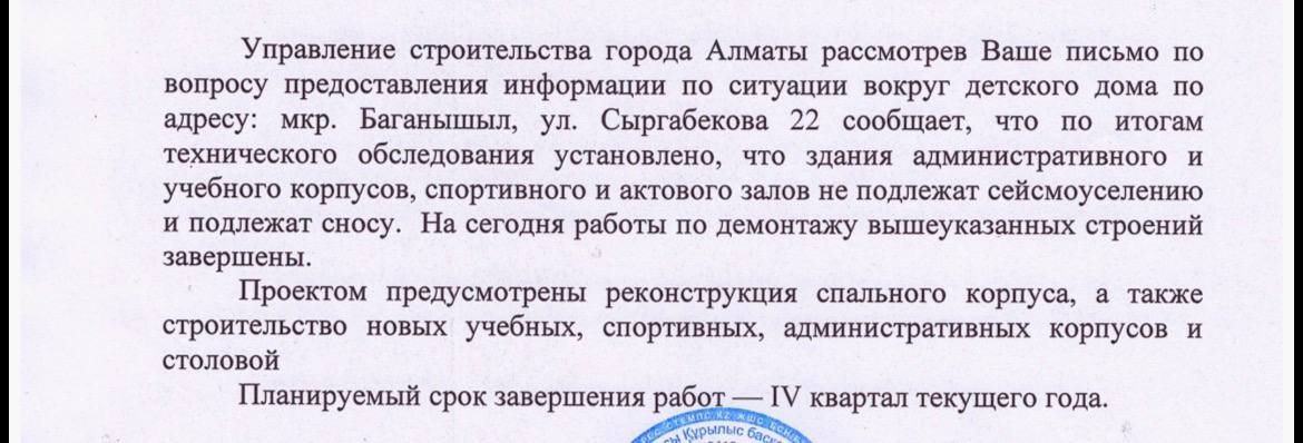 Управление строительства сообщило, что детский дом не подлежит сейсмоусилению и подлежит сносу. Также они указывают, что предусмотрены реконструкция спального корпуса и строительство новых корпусов, под конец этого года все работы должны быть завершены.