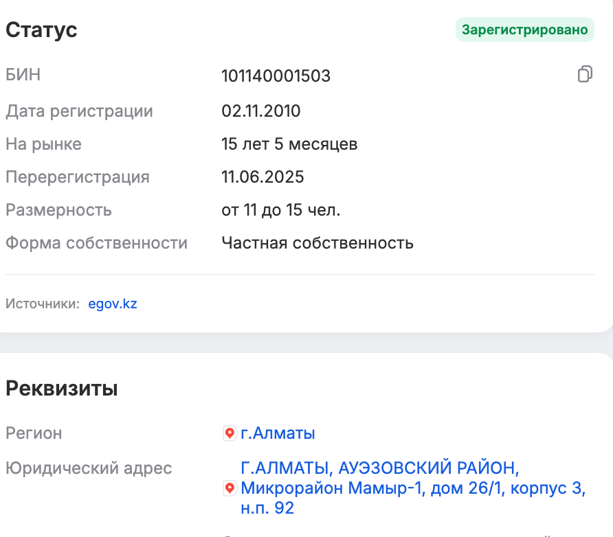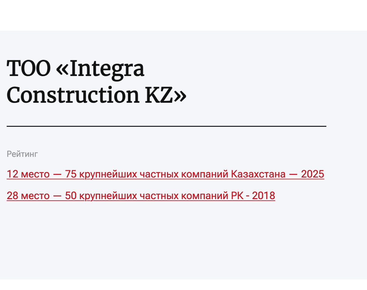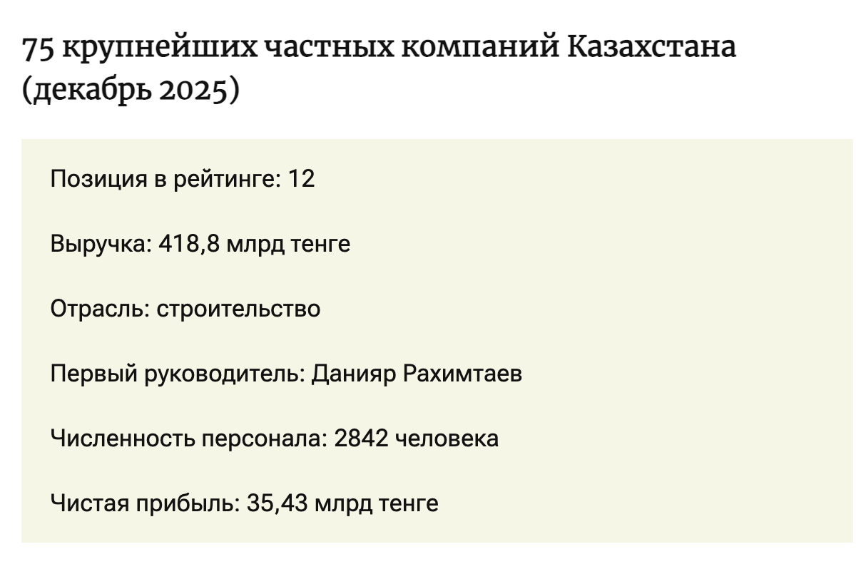 По итогам 2025 года компания заняла 12 место среди 75 крупнейших частных компаний страны с выручкой более 418 млрд тенге. Налоговые отчисления, по данным реестров, превышают 93 млрд тенге.