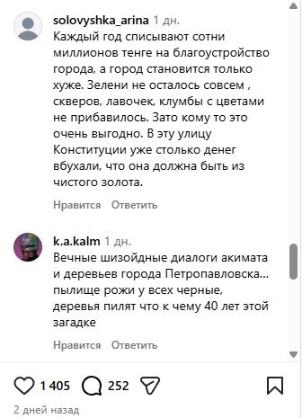 Из-за реконструкции улицы Конституции Казахстана (на участке от Жабаева до Горького) обновляют всю инфраструктуру, в том числе занимаются озеленением. В процессе спиливают деревья — в акимате утверждают, что они были в плохом состоянии и почти аварийные, это зафиксировано в городских документах. После ремонта обещают посадить новые деревья на тех же местах. Сообщения в соцсетях о том, что сносят здоровые деревья, в акимате называют недостоверными.