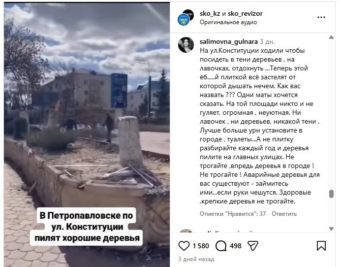 Но их всё-таки тронули. На отрезке улицы Конституции от Жамбыла до Горького рабочие убрали 17 деревьев, вызвав гнев у горожан.
