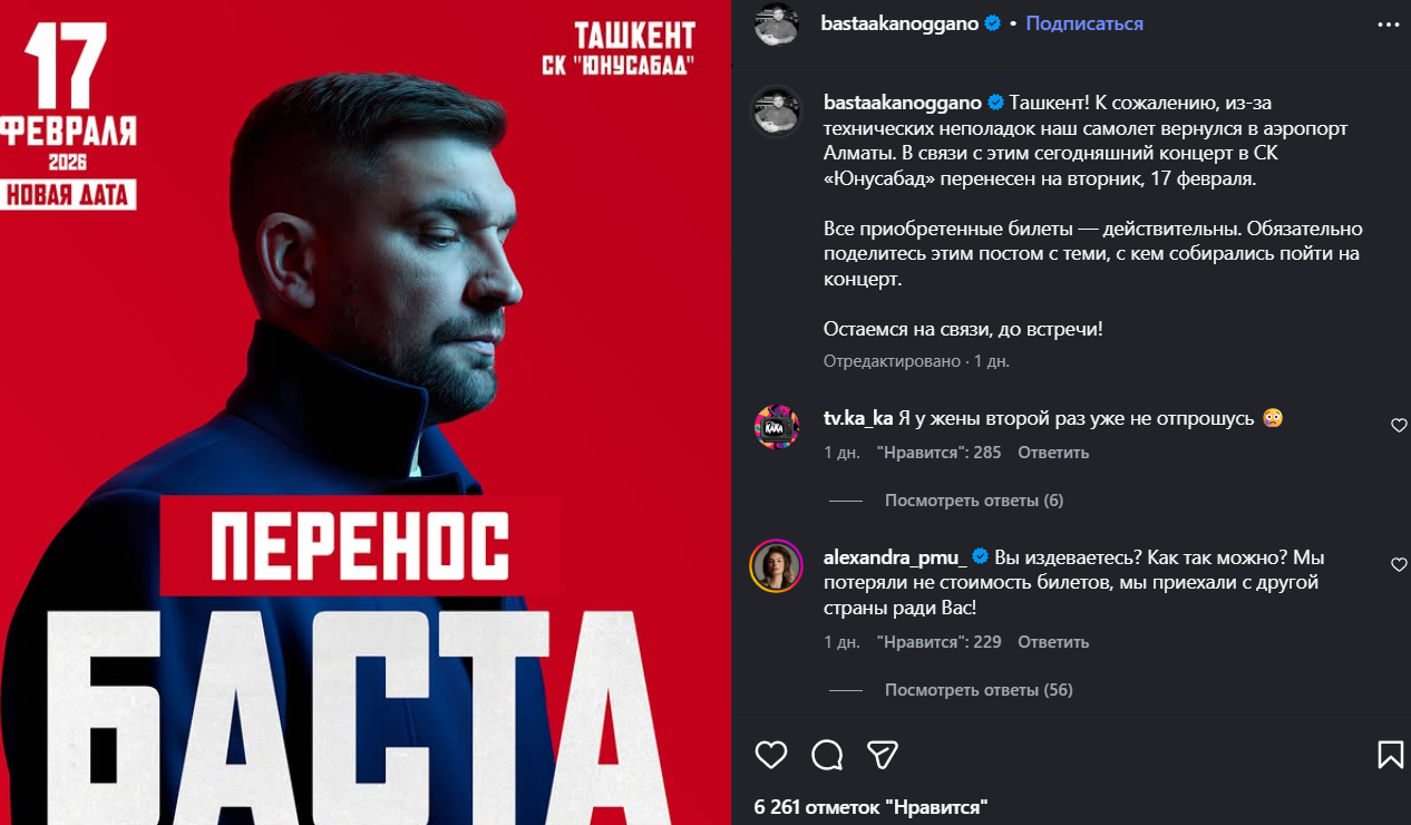 После концерта в Алматы Баста направился в Ташкент, где на следующий день было запланировано его выступление. Однако во время полета экипаж авиакомпании принял решение развернуть самолет и вернуться в Алматы. Посадка прошла в штатном режиме. По словам певца – причину в авиакомпании не назвали.