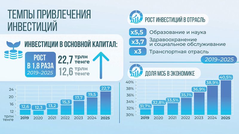 За семь лет объем инвестиций в основной капитал вырос с 12,6 трлн тенге до 22,7 трлн тенге. При этом существенно изменилась их структура: основной приток средств направляется в обрабатывающую промышленность, инфраструктуру, энергетику, логистику и агропромышленный комплекс.