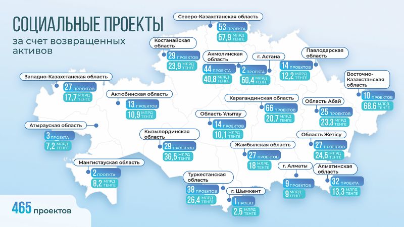 В сфере здравоохранения 183 объекта возведены на возвращенные средства, что дало возможность активизировать темпы реализации национального проекта по модернизации сельского здравоохранения. В результате в рамках нацпроекта в сельских населенных пунктах страны функционируют 655 новых объектов первичной медико-санитарной помощи. Помимо этого, за счет этих средств ведется строительство крупных медицинских центров, включая многопрофильную больницу и Центр гематологии в Восточно-Казахстанской области, станцию скорой медицинской помощи в Мангистауской области, операционно-реанимационный блок онкологического диспансера в Карагандинской области.