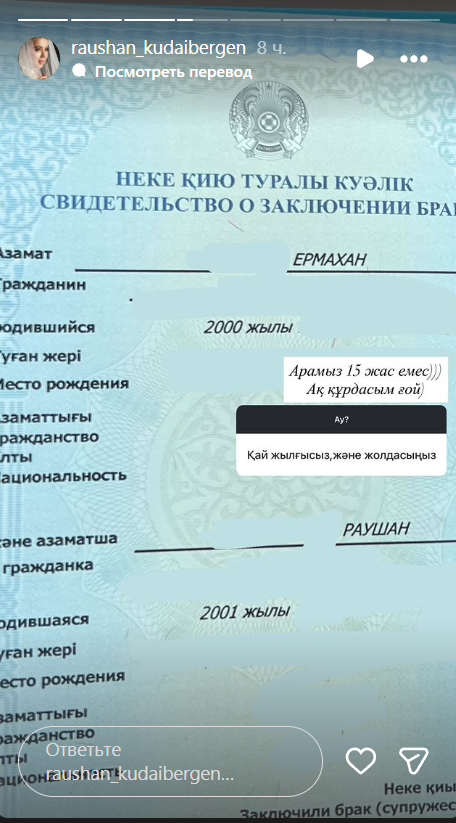 В Stories своего аккаунта Раушан опубликовала фото свидетельства о заключении брака, из которого следует, что она всего на год старше мужа. Таким образом она опровергла слухи о 15-летней разнице в возрасте.