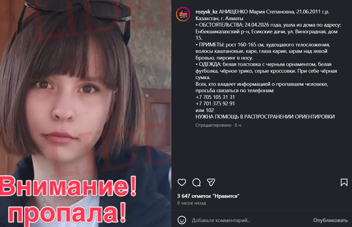 По имеющимся данным, 24 апреля 2026 года девочка ушла из дома по адресу: Енбекшиказахский район, Есикские дачи, улица Виноградная, дом 15, после чего ее местонахождение остается неизвестным.