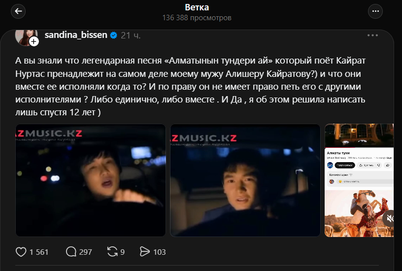 “А вы знали что легендарная песня “Алматынын тундери ай” который поет Кайрат Нуртас пренадлежит на самом деле моему мужу Алишеру Кайратову? И что они вместе ее исполняли когда-то? И по праву он не имеет право петь его с другими исполнителями? Либо единично, либо вместе. И да, я об этом решила написать лишь спустя 12 лет”, – рассказала об этом девушка.