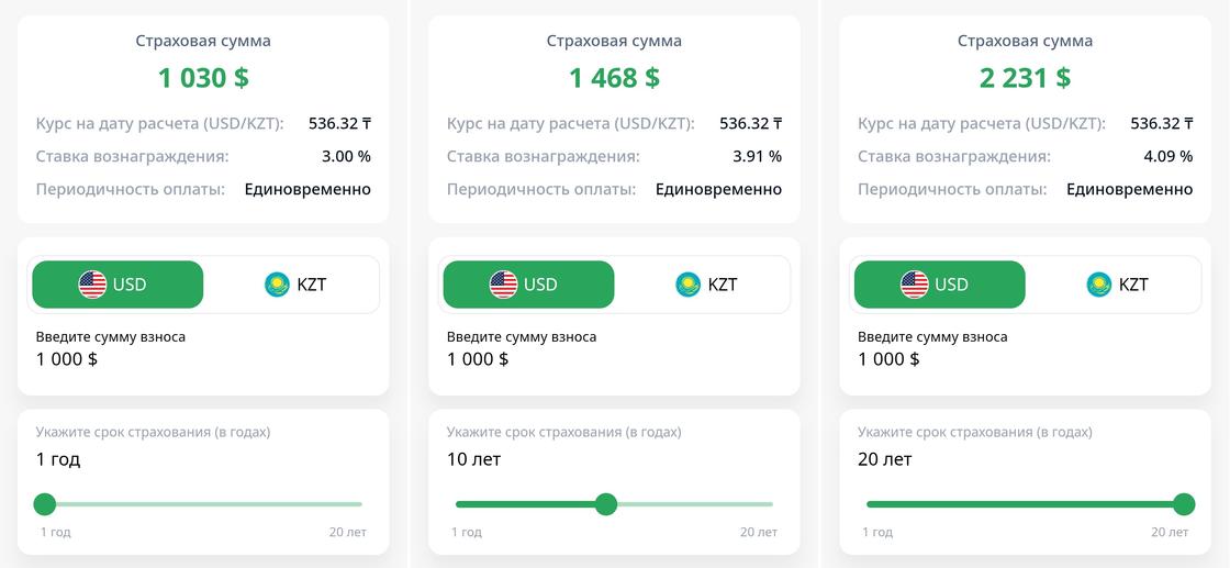 Для примера рассмотрим условия программы накопительного страхования "Халык-Казына". Она рассчитана на накопления в долларах США.