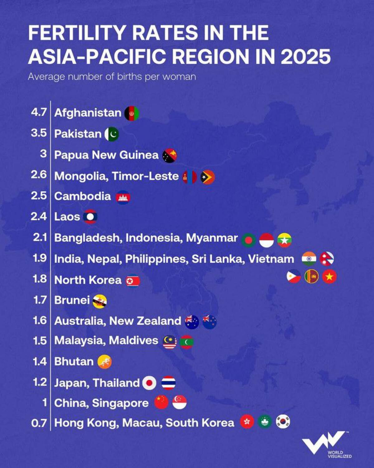 В Индии, Непале, на Филиппинах, в Шри-Ланке и Вьетнаме средний показатель уже опустился до 1,9 рождения на женщину. КНДР следует за ними с уровнем 1,8, а в Брунее он составляет 1,7.