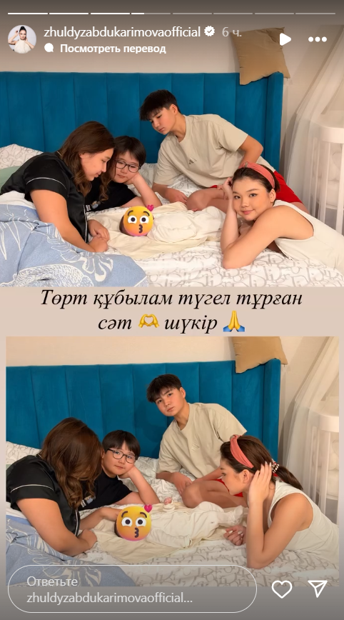 По словам Жулдыз, в их доме царит особая атмосфера счастья: дети актрисы вышли на школьные каникулы и теперь помогают заботиться о новорожденной дочери Рабии Султан.
