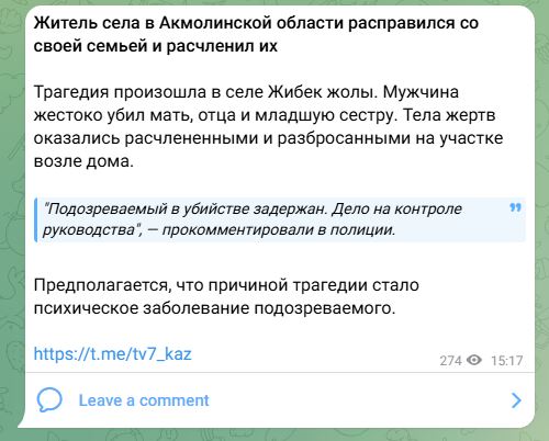 Сын убил и расчленил родителей и сестру в селе под Астаной