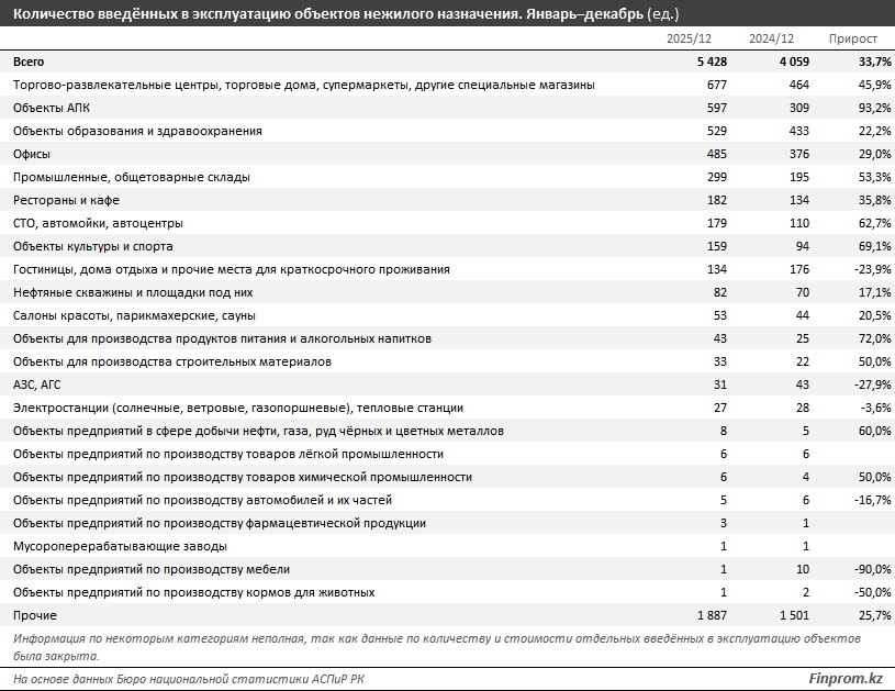В 2025 году в стране ввели в эксплуатацию более 5,4 тысячи новых предприятий, школ, больниц и торговых центров. Общее количество сданных нежилых объектов выросло на 33,7% по сравнению с 2024 годом.