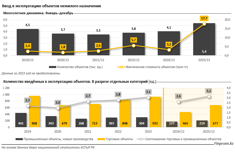 Фактические затраты на строительство дошли до 17,7 трлн тенге. Такой скачок специалисты связывают с открытием в 2025 году промышленных гигантов, среди которых предприятие по добыче урана в Туркестанской области, завод по обогащению вольфрамо-молибденовой руды в Алматинской области и новый нефтяной объект в Атырауской области.