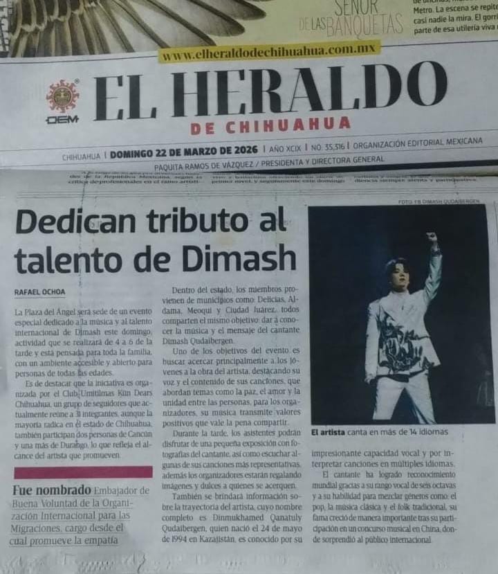 Как сообщает El Heraldo de Chihuahua, в стране набирает популярность музыка артиста во многом благодаря инициативе местных поклонников. Фан-клуб Umitilmas Kun Dears Chihuahua запустил масштабную акцию под названием “Мир должен узнать Димаша”. В рамках кампании с 9 марта по 9 апреля на электронных экранах торгового центра Plaza Sendero La Fé транслировались видеоматериалы об исполнителе, в том числе в зонах кинотеатра и фудкорта, где поток посетителей особенно высок.