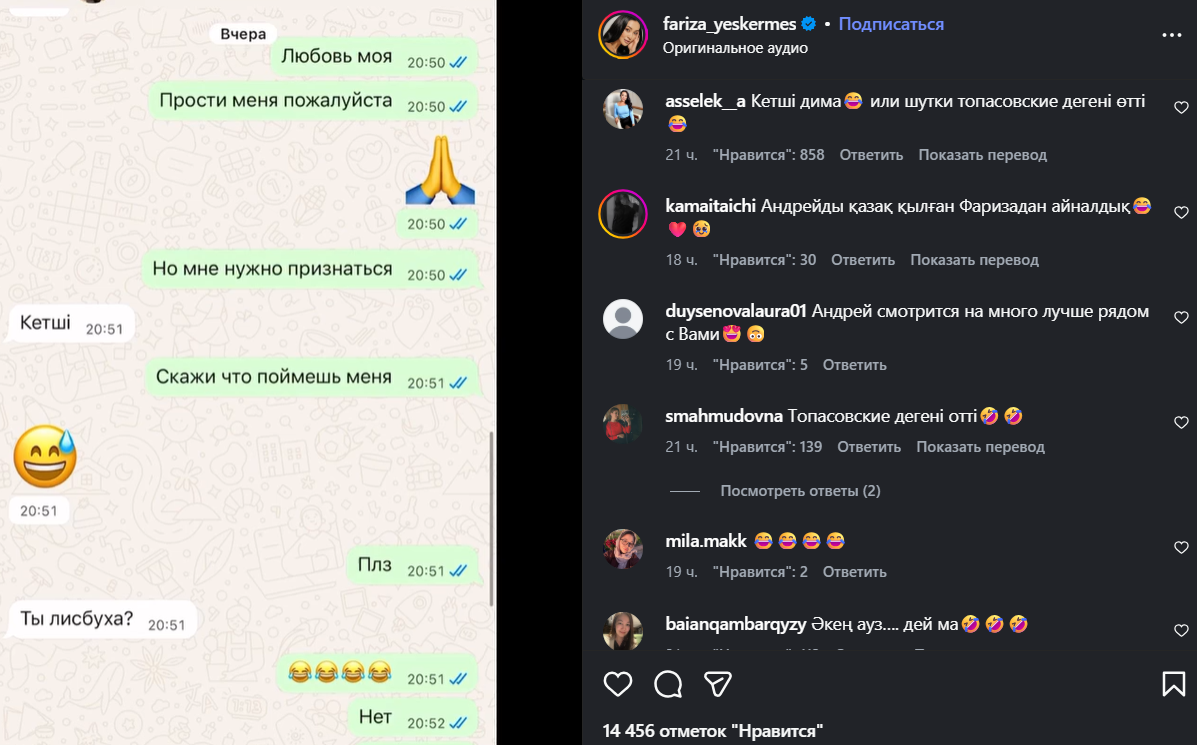 Публикация быстро разлетелась по сети и вызвала активное обсуждение среди пользователей. Большинство комментаторов отнеслись к ситуации с юмором, однако особое внимание привлекло то, что Андрей в переписке частично использовал казахский язык.