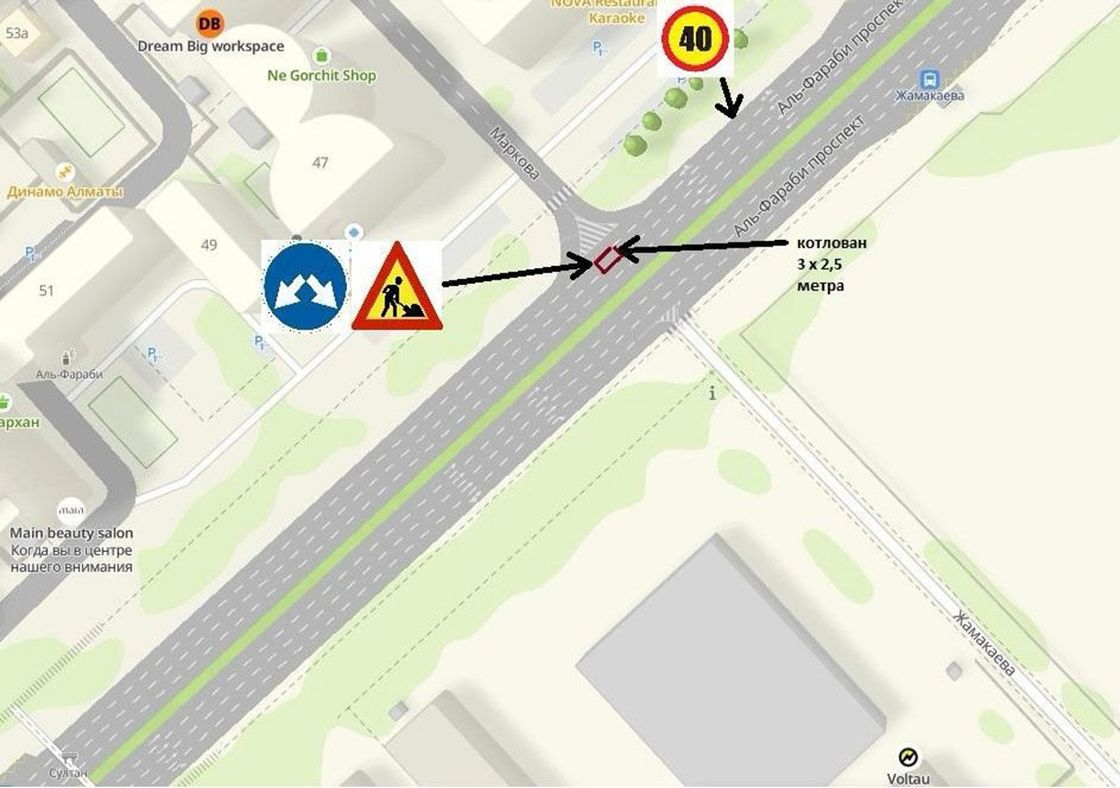 В связи с выполнением необходимых работ на участке пр. Аль-Фараби в районе пересечения с ул. Маркова будет временно перекрыта одна полоса движения. Ограничение будет действовать с 21:00 15 ноября до 12:00 16 ноября", - говорится в сообщении акимата.