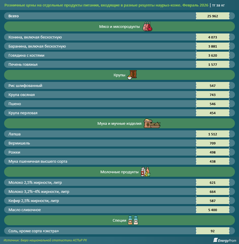 В какую сумму обойдётся казахстанцам приготовить традиционное блюдо Наурыз коже в 2026 году, посчитали аналитики Energyprom.kz.