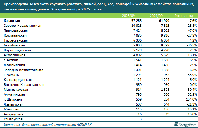 За январь–сентябрь текущего года в РК было произведено 57,3 тыс. тонн свежего или охлаждённого мяса крупного рогатого скота, свиней, овец, коз, лошадей и животных семейства лошадиных - на 7,6% меньше, чем за аналогичный период 2024-го.