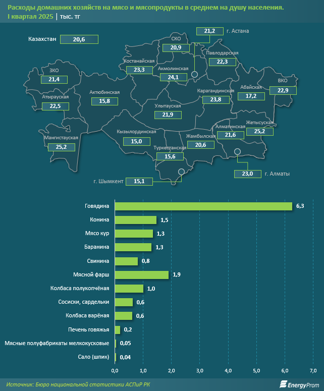 Меньше всего мяса и мясопродуктов во втором квартале 2025-го потребили жители Кызылординской области: 15 кг на человека, против 16,2 кг годом ранее. Весьма скромные показатели также были отмечены в Шымкенте и Туркестанской области: 15,1 и 15,6 кг соответственно.