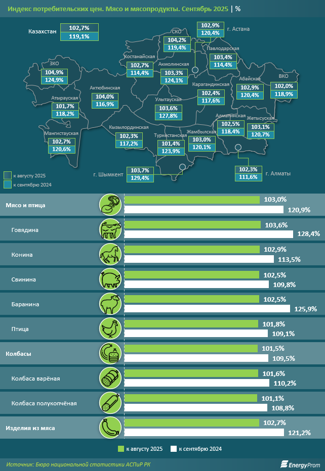В годовой динамике наибольший рост цен на мясо и мясопродукты был зафиксирован в Шымкенте (на 29,4%), а также в области Улытау (на 27,8%) и Западно-Казахстанской (на 24,9%) области. Наименьшее удорожание наблюдалось в Алматы (на 11,6%), а также в Костанайской и Павлодарской областях (на 14,4% в каждом из регионов).