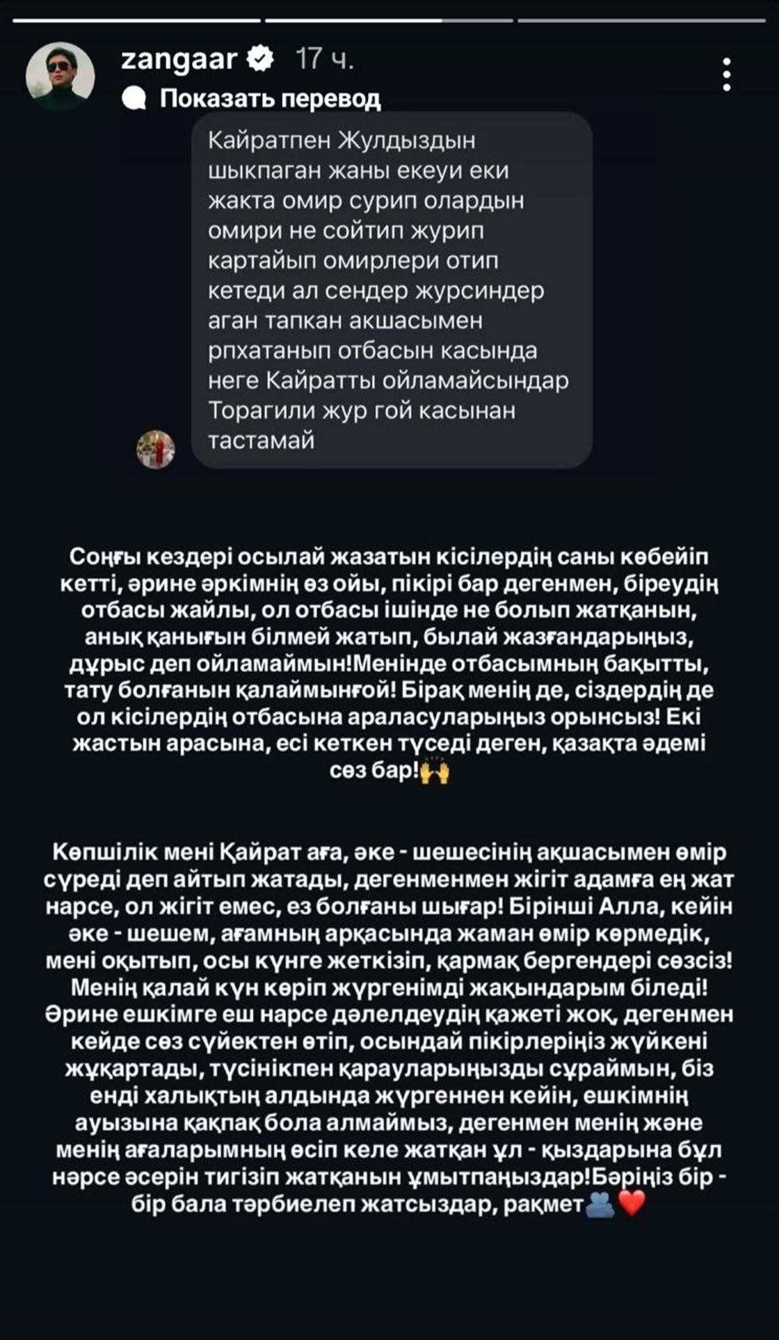 Младший брат казахстанского певца Кайрата Нуртаса Зангар ответил на обидные высказывания некоторых комментаторов в соцсети относительно его семьи, передает NUR.KZ.