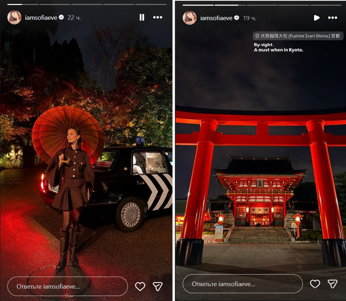 На фото в сторис она показала место, куда отправилась, - это храмовый комплекс Фусими Инари. Храм является важной синтоистской святыней в южном Киото. Он был основан в 794 году.