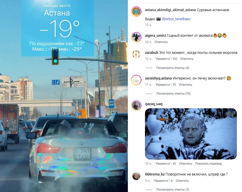 Пользователи сети активно комментируют видео. Даже столичный район Сарайшык поинтересовался, включает ли автолюбитель печку: