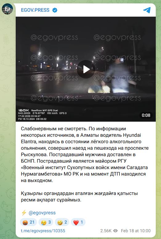 По данным издания egovpress, пострадавший является майором РГУ “Военный институт Сухопутных войск имени Сагадата Нурмагамбетова” МО РК. Редакция Liter.kz обратилась за комментарием в пресс-службу Министерства обороны: