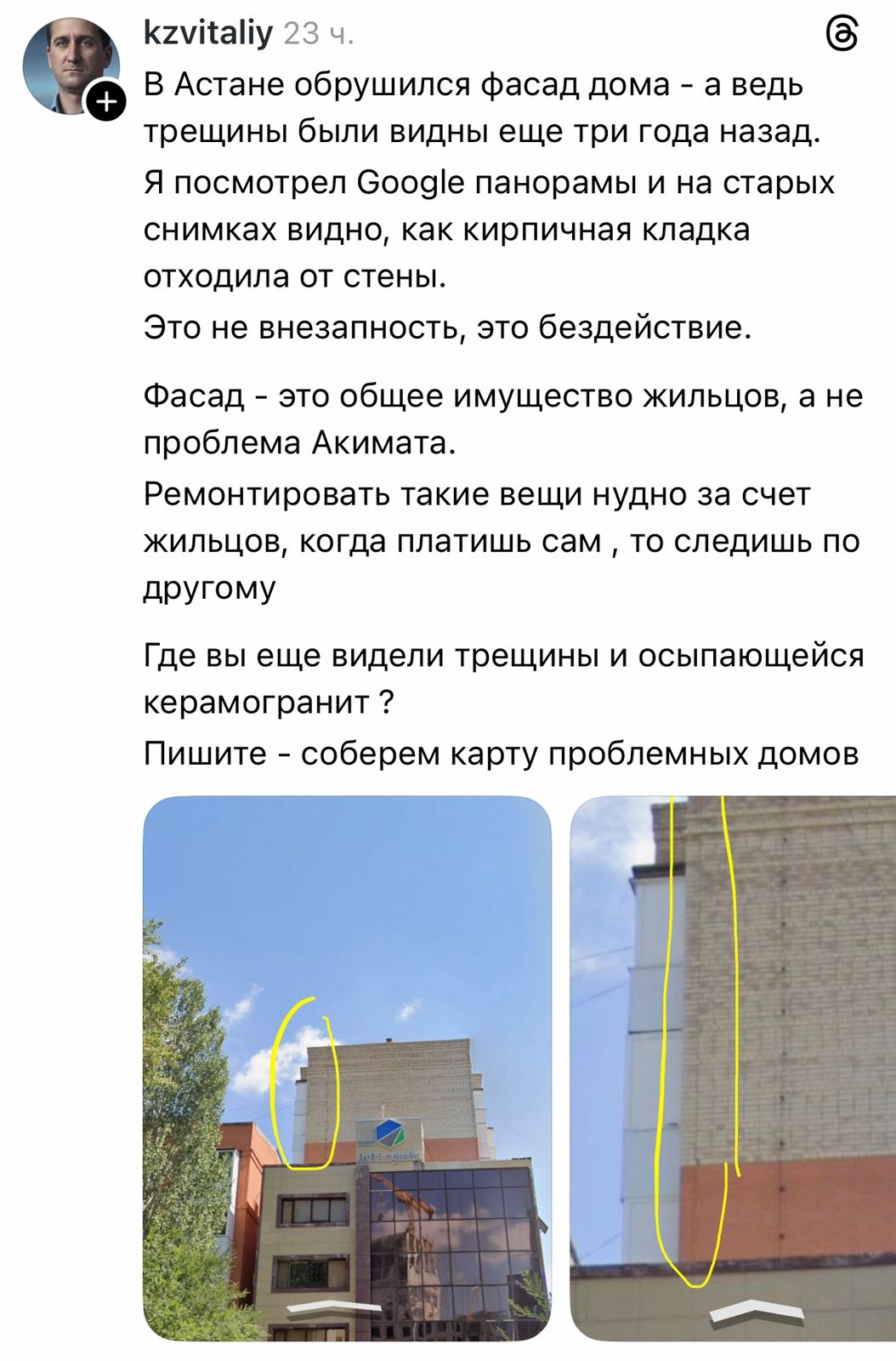 В своем обращении в социальных сетях жильцы дома обратились к акимату с просьбой провести реставрацию здания, так как опасаются повторного обрушения и трагедий, которые могут стоить жизни не одному человеку.