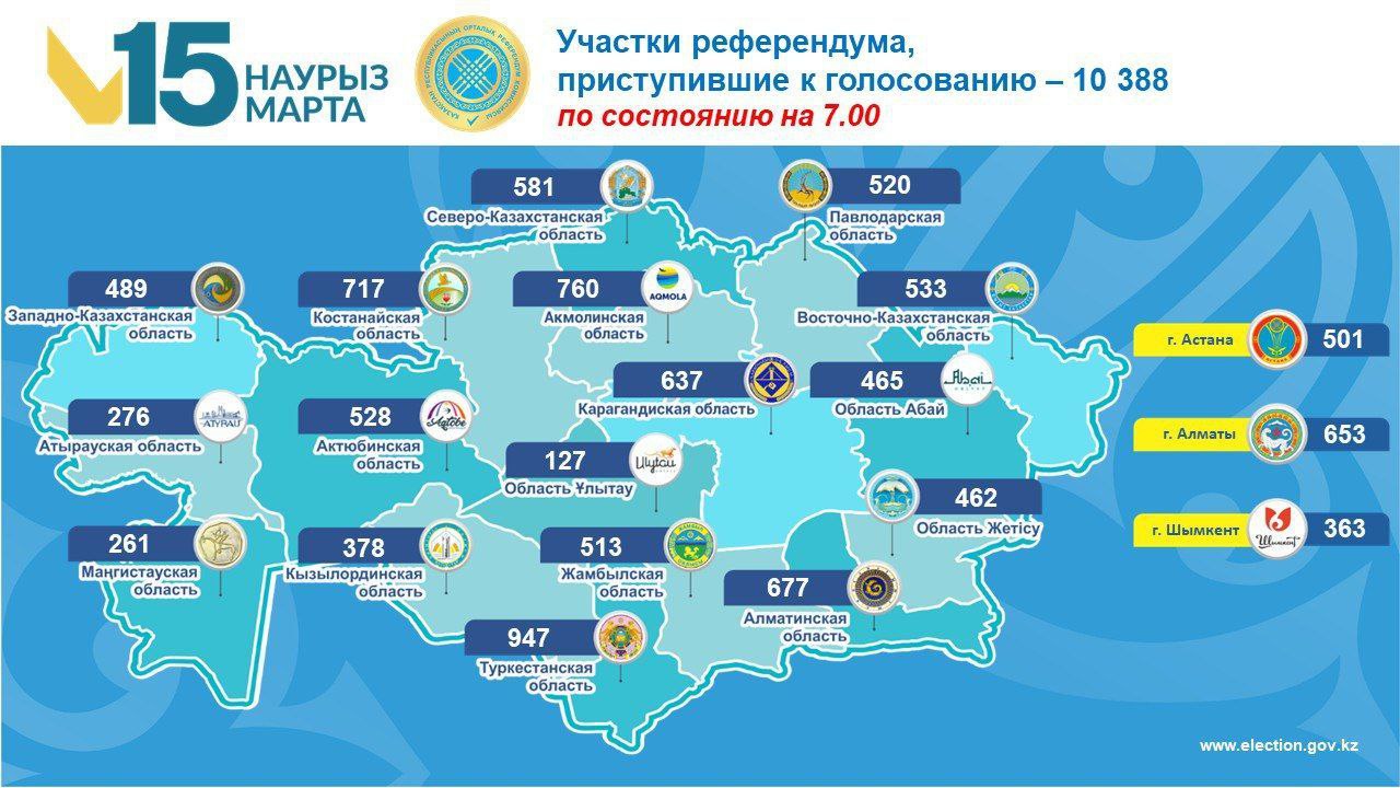 Согласно данным, представленным областными, городов республиканского значения, столицы комиссиями по состоянию на 7:00 15 марта 2026 года в регионах все 10 388 участков приступили к голосованию, передает Liter.kz со ссылкой на ЦИК РК.
