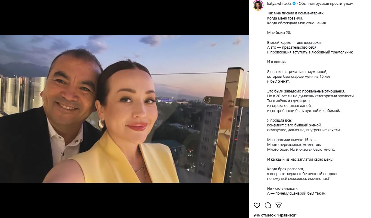 Когда брак распался, она впервые задала себе вопрос не о том, кто виноват, а почему ее жизненный сценарий сложился именно так. В своем посте она говорит о “кармических узлах” и работе над собой. По ее словам, осознание собственных ошибок и внутренних дефицитов стало точкой роста.