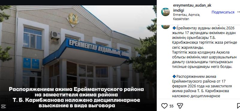 “Распоряжением акима Ерейментауского района от 17 февраля 2026 года на заместителя акима района Т. Б. Карибжанова наложено дисциплинарное взыскание в виде выговора”, – сообщает пресс-служба акимата.