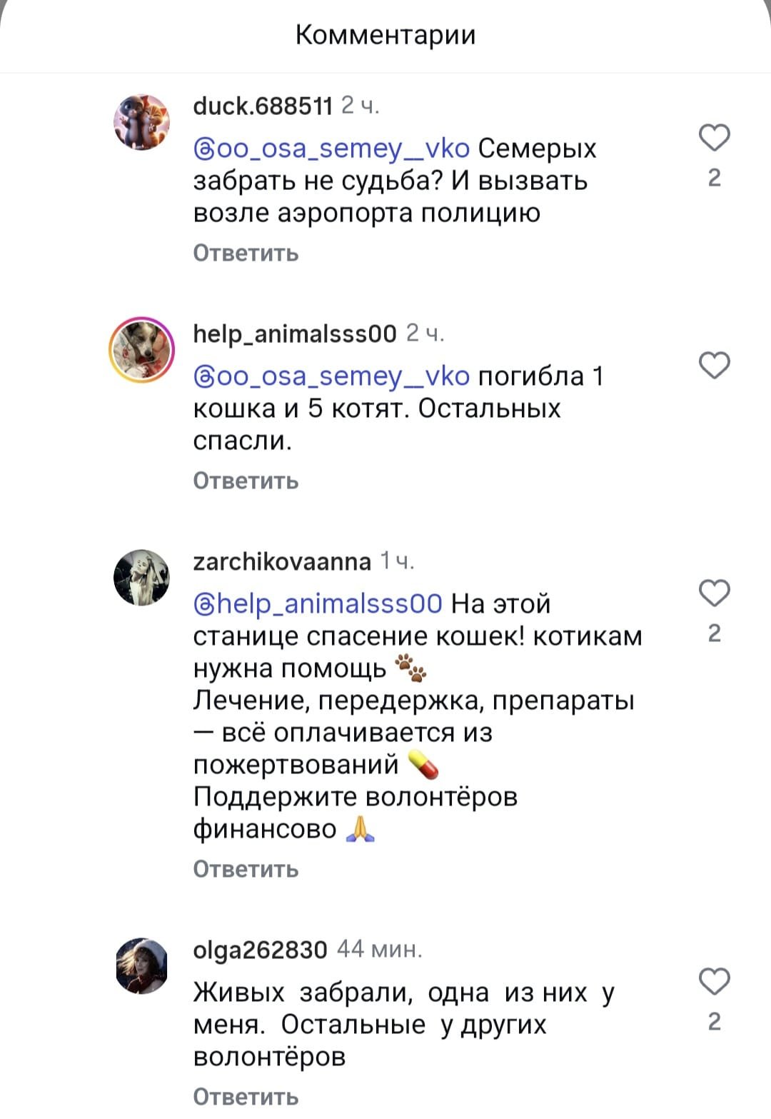 По предварительной информации общественного объединения ОСА, когда животных нашли, около 12 из них уже были мертвы, большинство — маленькие котята.